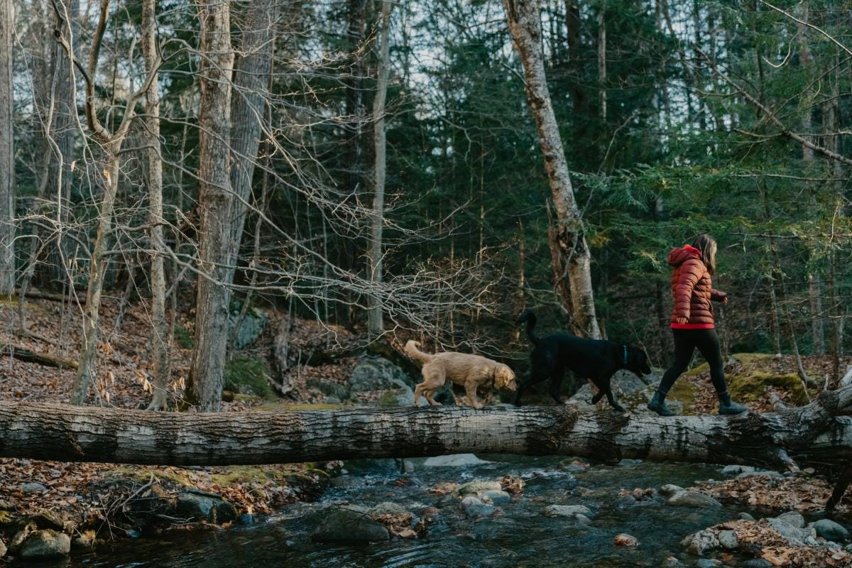 What’s most magical about experiencing these trails, though, is taking in the impact of the seasons. By the end of the summer, maybe, I’ve developed confidence in my routes. I’ve formed some signposts in my mind to look out for. I’ve become light on my feet, easily able to avoid the rocks and crevices begging to trip me. Once those leaves drop? The experience becomes completely different. The forest becomes carpeted in brilliant red, yellow, and orange leaves. All the trails are hidden and whatever sign points I’d grown used to become useless. The leaves make it more slippery and hide the rocks. I need to think about every step. Fall brings hunting season as well, and there’s gunshots in the distance. The dogs wear bright orange vests, and I must keep them close. Over the next few months, we develop new routines, signposts, running styles. And then the weather changes again, making everything different. The experience starts a-new, again, over, and over.